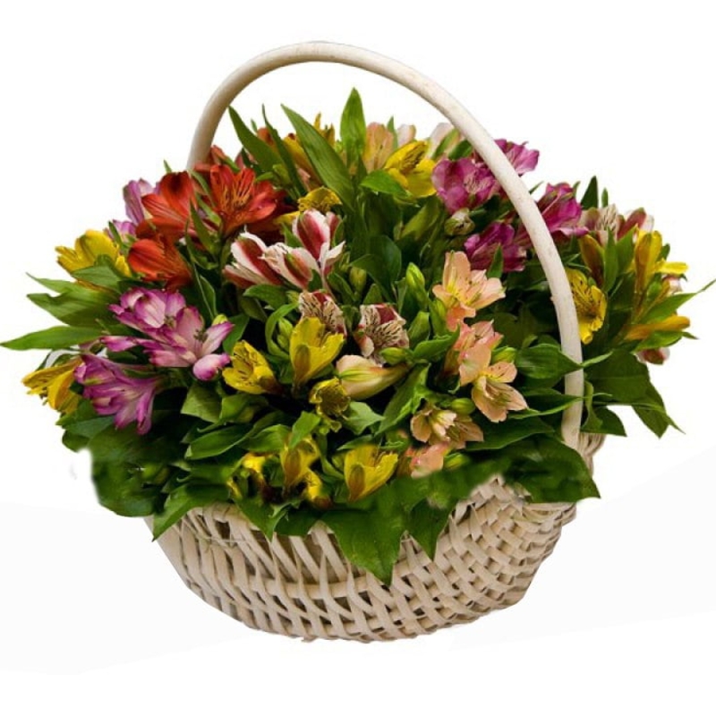 Букет состоит из 15 разноцветных альстромерий, зелень, корзина, оазис.