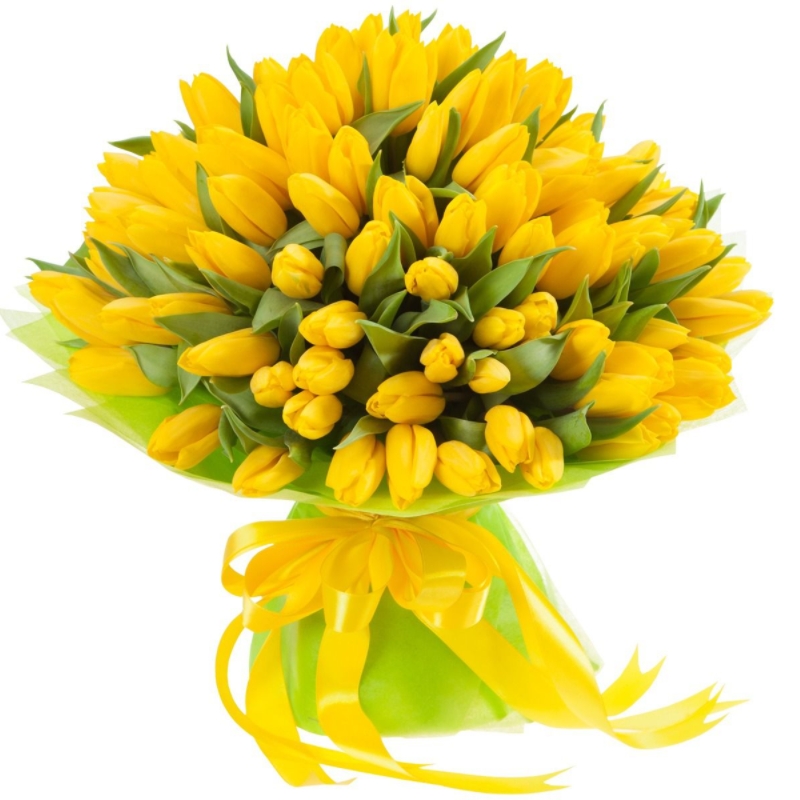 Букет состоит из 101 желтый тюльпан, красивая упаковка, атласная лента.