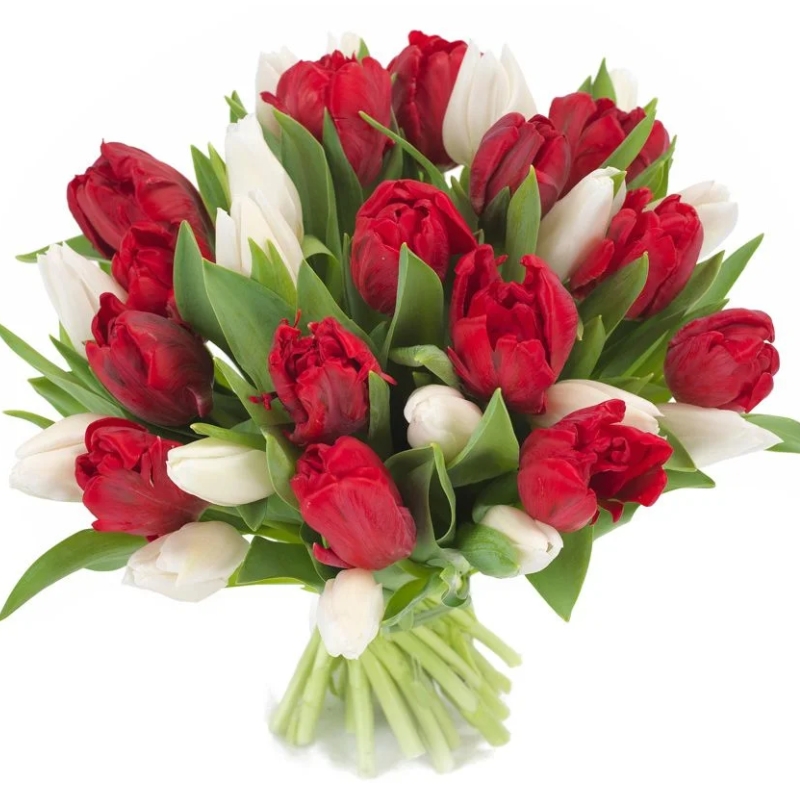 Букет состоит из 18 белых тюльпанов, 17 красных тюльпанов, прозрачная упаковка, атласная лента.
