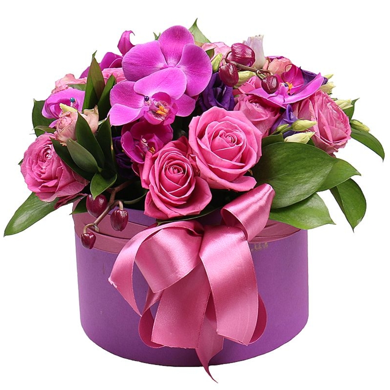 Букет состоит из 11 роз, 5 орхидей, 3 ветки эустомы, 3 гиперикум, зелень, коробка, оазис, атласная лента.