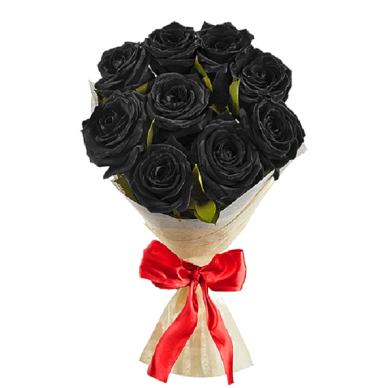 Букет состоит из 9 черных роз, зелень, крафт, атласная лента.