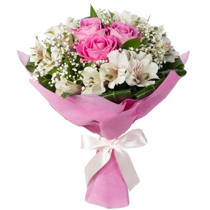 Букет состоит из 3 розовые розы, 6 веток альстромерий, 2 ветки гипсофилы, аспидистра, упаковка, лента.