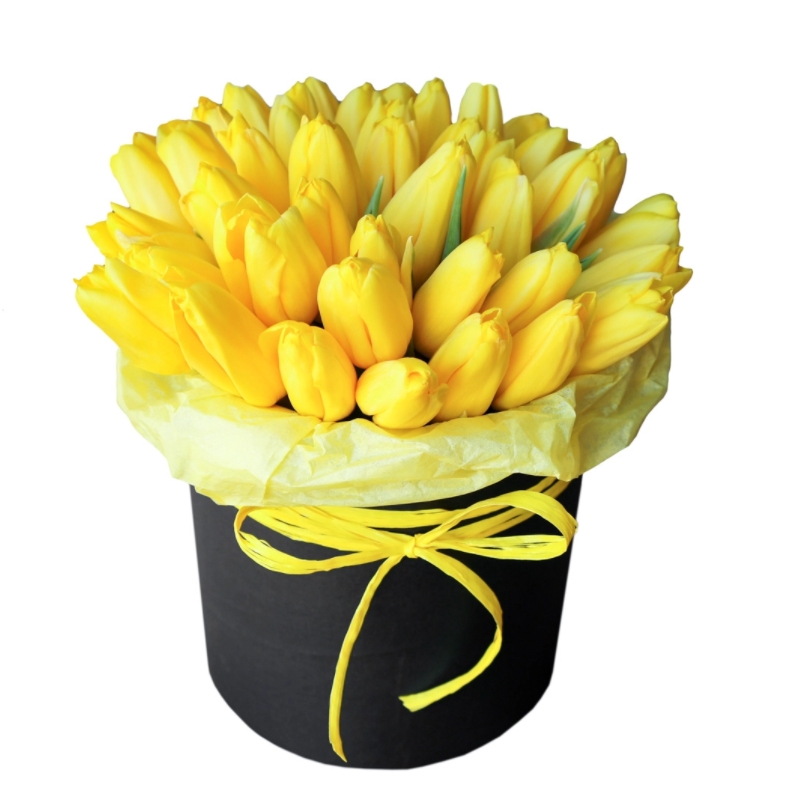 35 желтых тюльпанов, черная коробка, желтая лента.