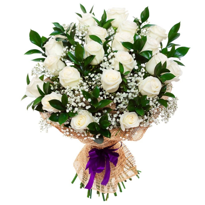 Букет состоит из 21 белая роза, 2 ветки гипсофилы, красивая упаковка, зелень.