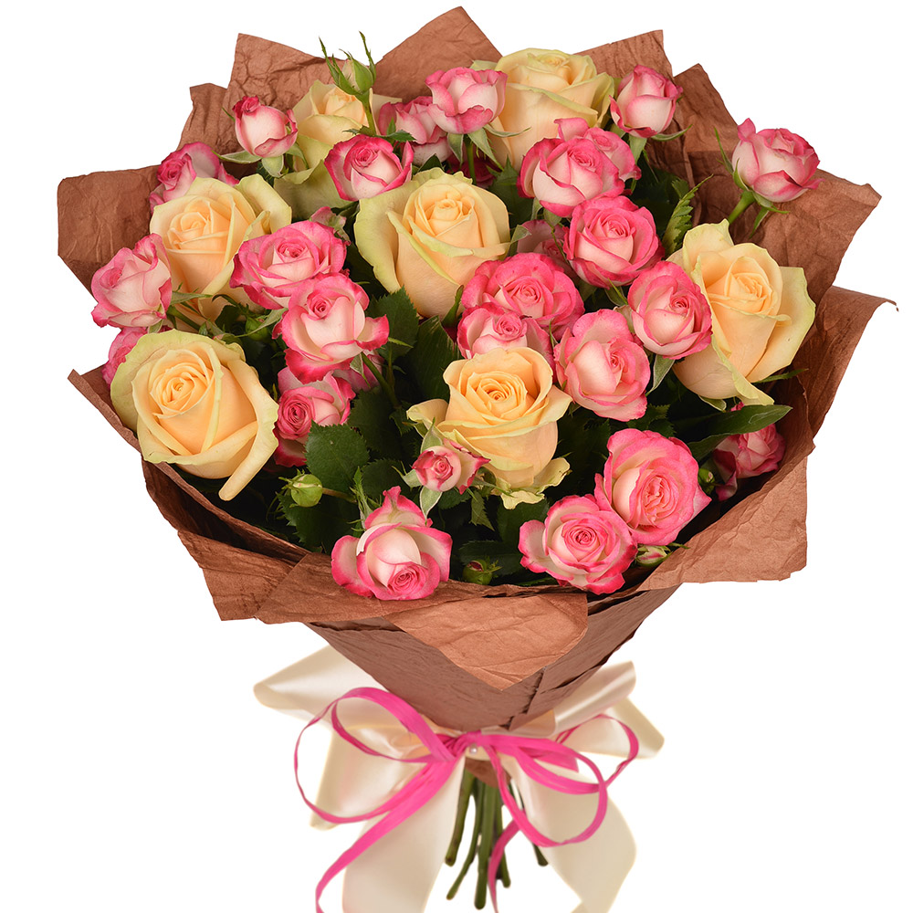 Букет состоит из 7 кремовых роз, 6 веток розовой кустовой розы, крафт, кремовая или розовая лента.